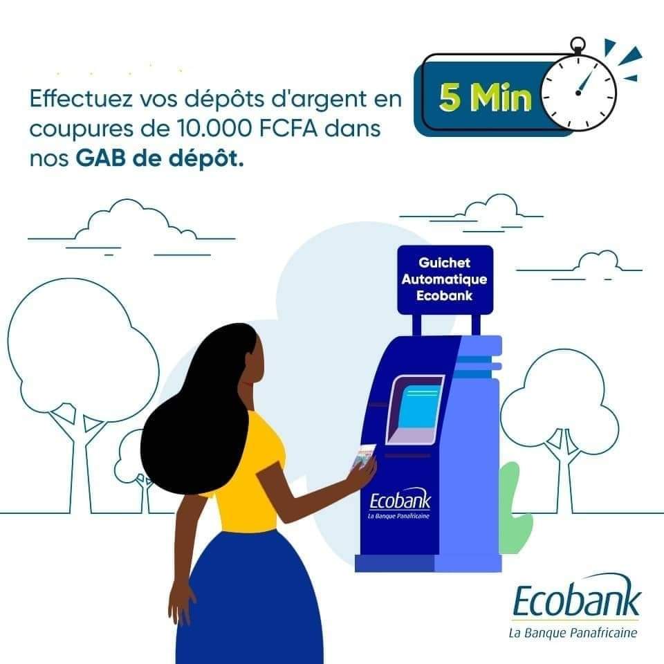 Alors désormais « Effectuez vos dépôts en coupures de 10.000 FCFA sur tous les types de comptes bancaires Ecobank dans nos 𝗚𝗔𝗕 𝗱𝗲 𝗱é𝗽ô𝘁𝘀« : Indique la Direction Générale